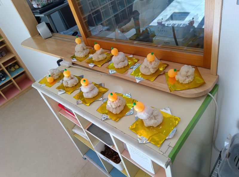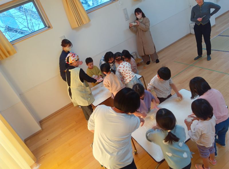 - 1月8日に餅つきを行いました。年長組のお父さん方にも手伝っていただき、ある程度つけたところで子どもたちも餅つきに挑戦。それぞれの年齢に応じた大きさの杵でついていき、最後は年長組が大きな杵で餅つきをしました。みんなの声援を受けながら、重たい杵をよろけながらも持ち上げていました。ついたお餅で鏡餅を作りました。つきが少々甘かったようで丸めるのに苦労していましたが、何とか形になりました。出来上がった鏡餅は皆さんの無病息災を願って玄関に飾りました。